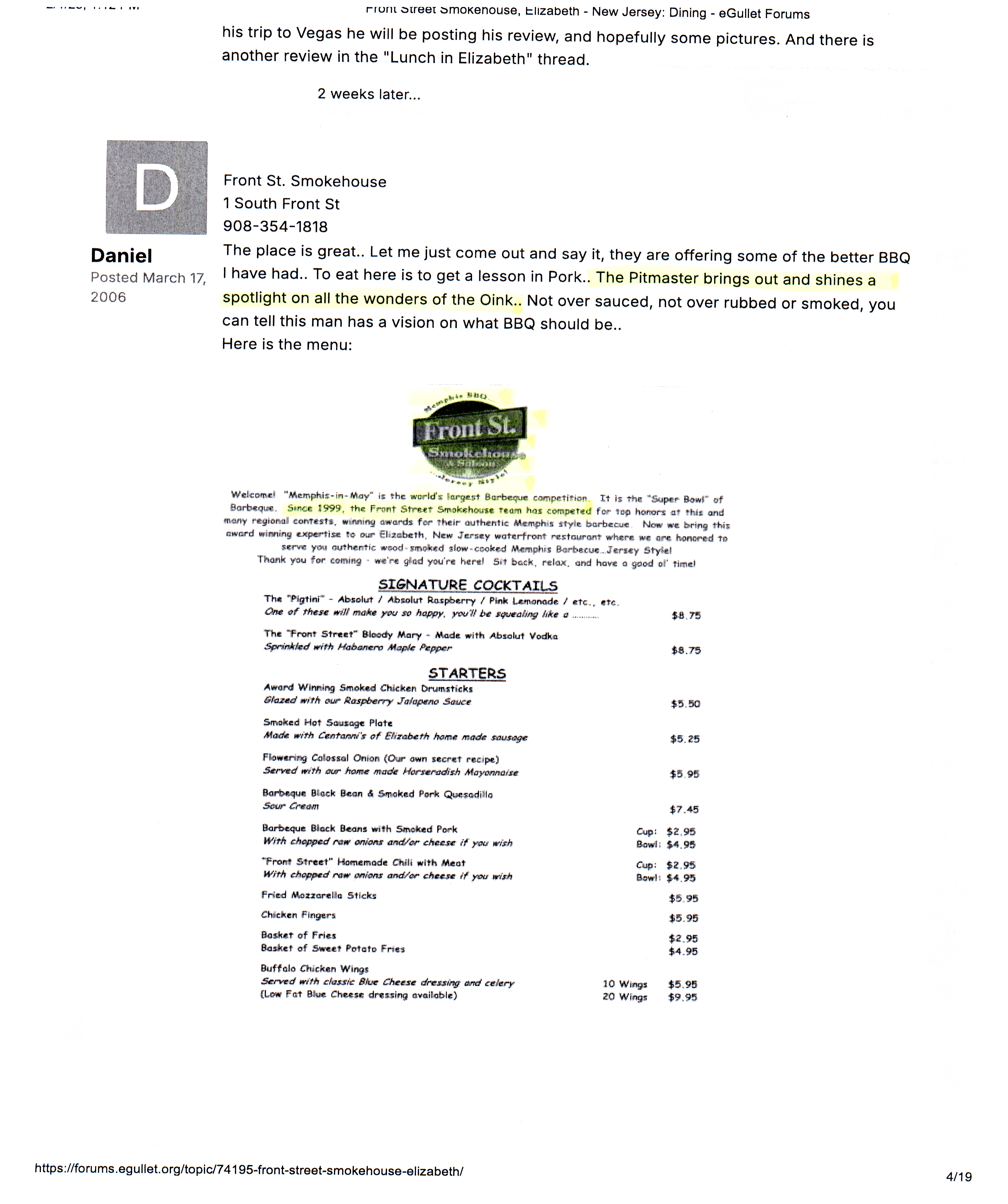 Front Street Smokehouse & Saloon, Inc., according to a comment posted on an